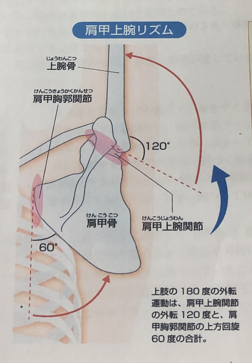 つまり、3度の外転運動は、2度の肩甲上腕関節と1度の肩甲胸郭関節の上方回旋によって成されるのである。これを「肩甲上腕リズム」と呼び、180度の外転(最大挙上)運動は、肩甲上腕関節の120度と肩甲胸郭関節の上方回旋 60度の合計となります。