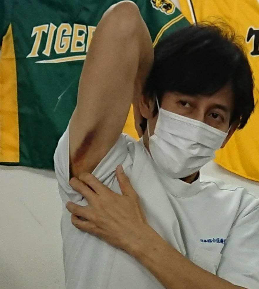 筋肉痛が激しくあったのに更に練習で腕を振りすぎた事で筋挫傷(肉離れ)を起こしてしまったようです。