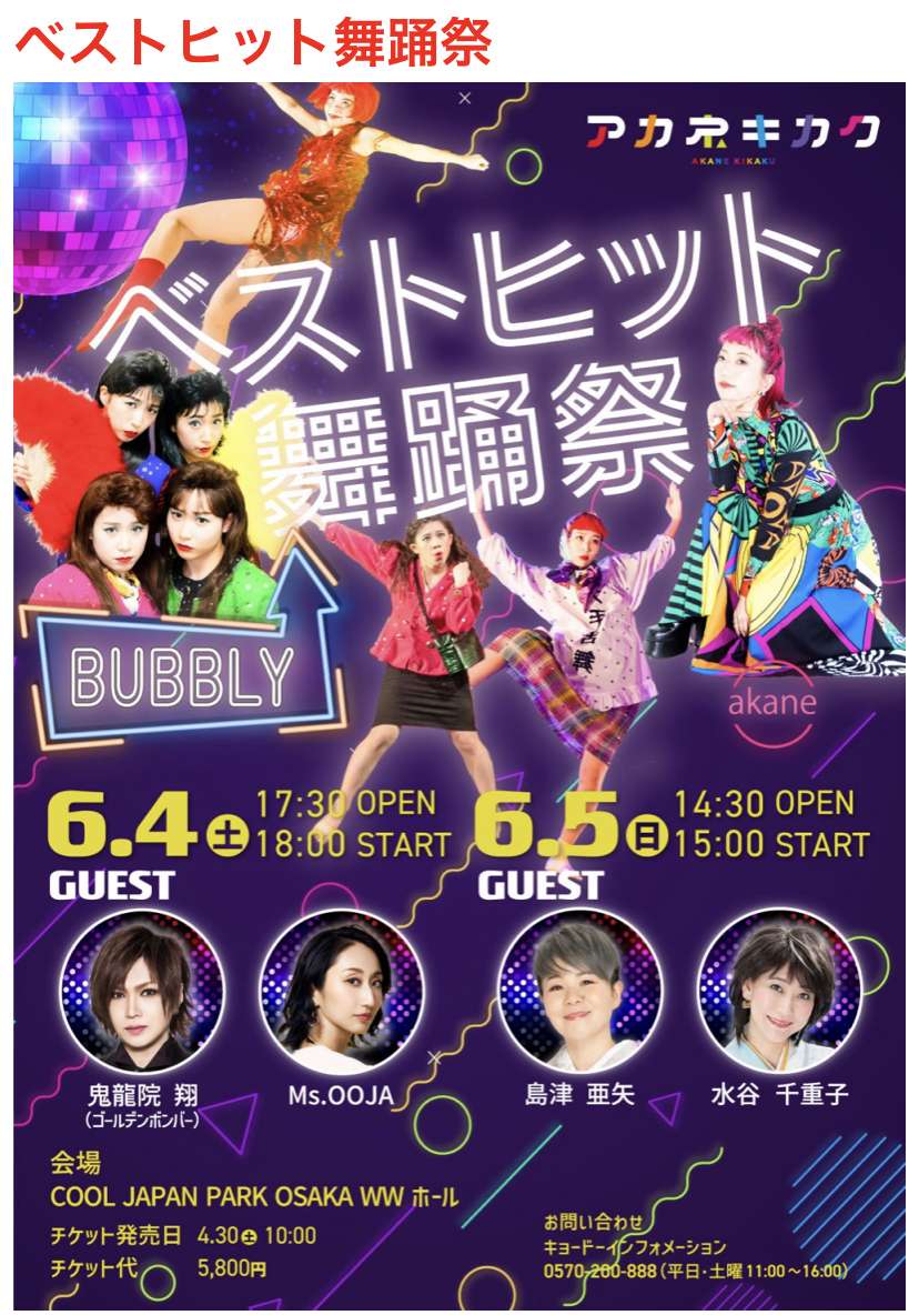 以前、治療院にも来てもらったakaneさんの企画による『ベストヒット舞踊祭』が今週末の4日土曜日と5日日曜日の2日間COOL JAPAN PARK OSAKA WWホールで開催されるとスタッフから連絡がありました。