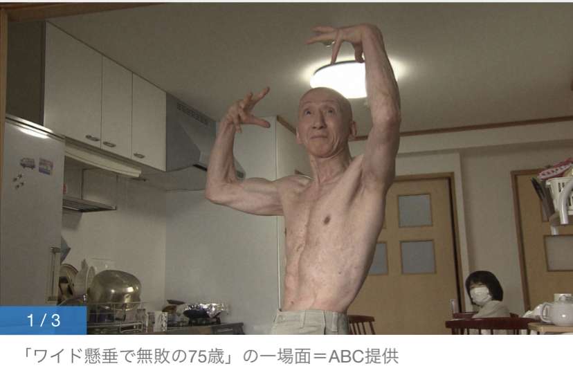 先週6月24日金曜日放送の探偵ナイトスクープに出ていた75歳のおじいちゃんについては、ワイドチンニングといって、両腕を大きく開いた懸垂を19歳〜40歳代の毎日トレーニングをしている逆三角形のマッチョな人達と勝負した結果、そのおじいちゃんがなんと30回もやり、他の人の最高が27回でした。