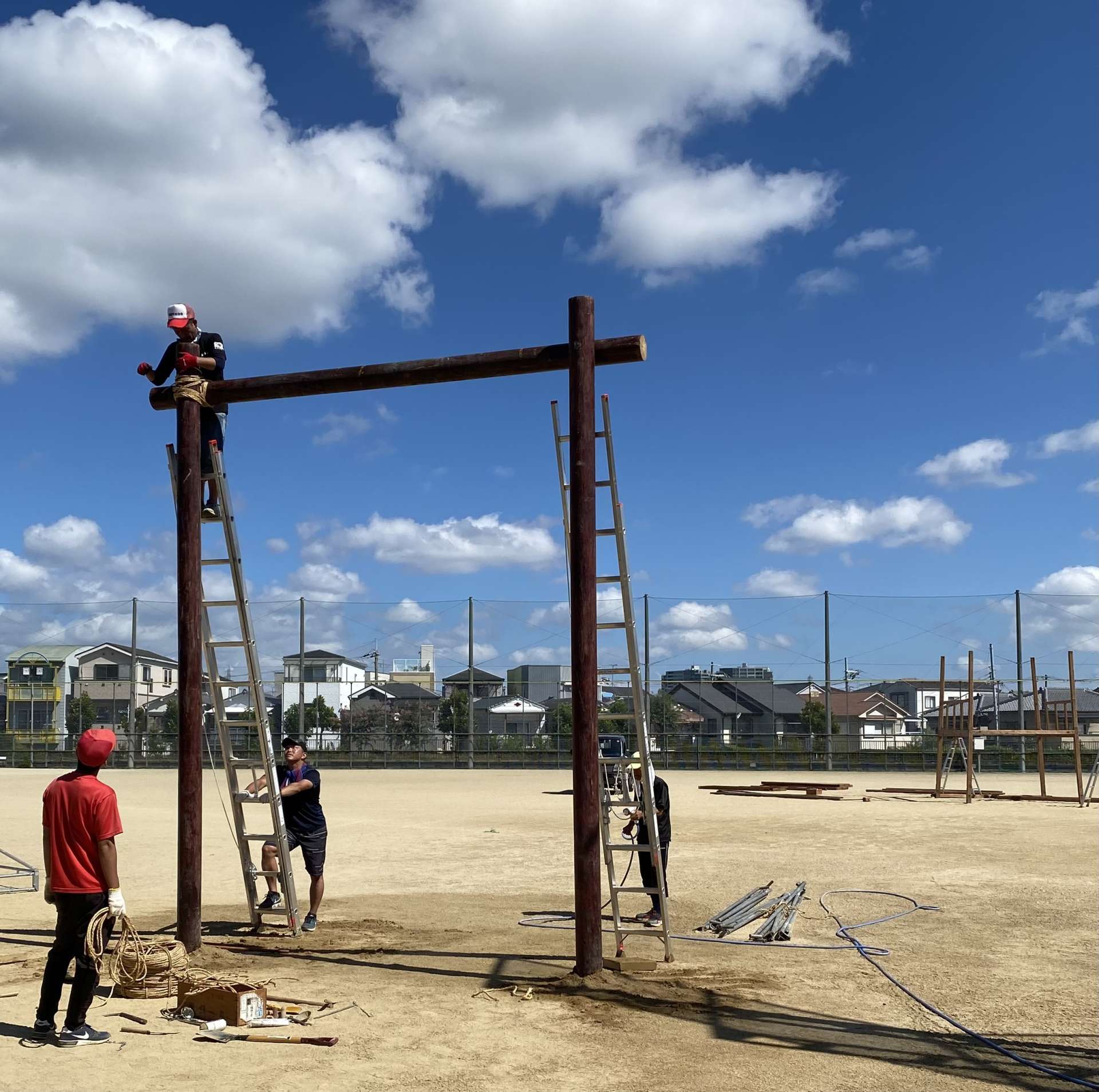 炎天下の中こまめに休憩を取りながら、テントを組んだり、櫓を建てたりと約3時間で予定の設営は終了しました。