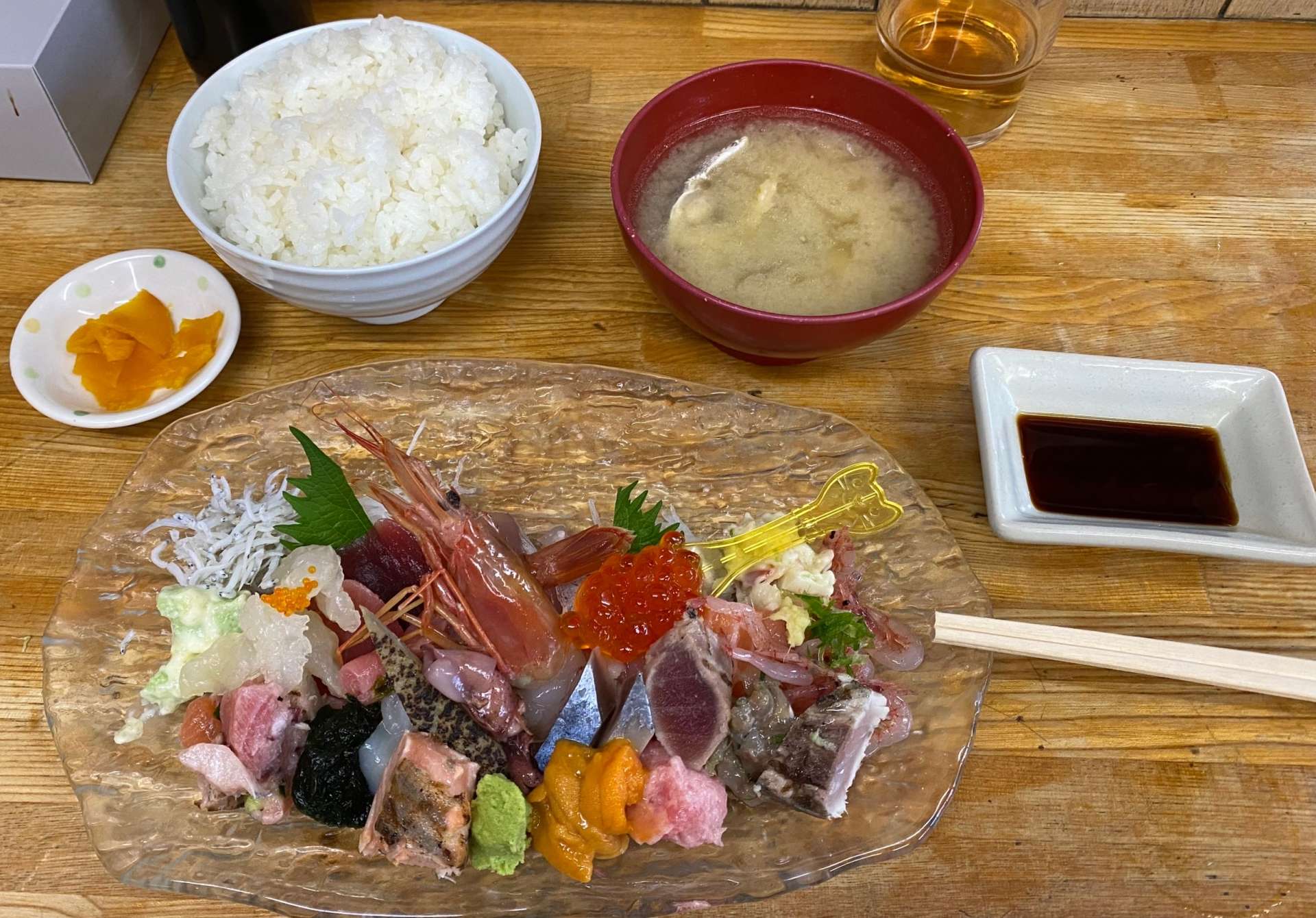 一体何種類くらい盛られているの?と思うほど色とりどりの魚や貝類。魚のアラの味噌汁も良い出汁が出ていて美味しかったです😋